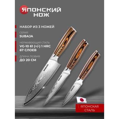 покрытие > Набор кухонных ножей из дамасской стали, Seburo SUBAJA Damascus, Поварская тройка - профессиональные японские ножи